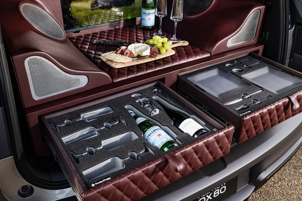 Основной изюминкой концепта Infiniti Autograph Lounge является, как ни странно, багажное отделение, которое снабдили роскошной отделкой. Здесь установлен довольно большой телевизионный экран, выведены динамики акустической системы Klipsch, а в нижней части имеется пара выдвижных ящиков, отделанных бордовой кожей с ромбовидной строчкой. Внутри этих отсеков хранятся бутылки с водой и вином, штопор, бокалы, квадратные тарелки и столовые приборы.