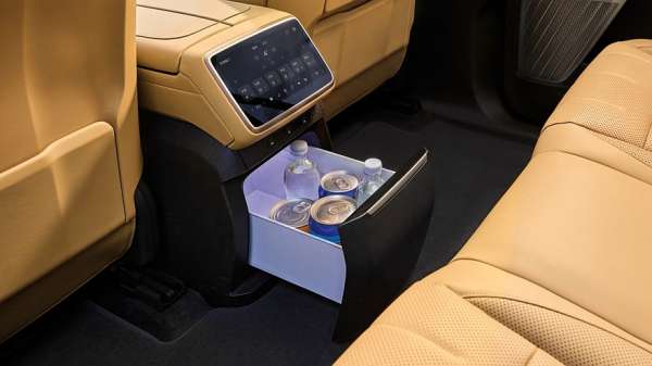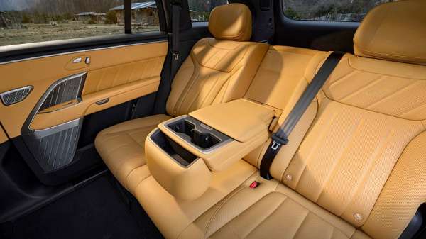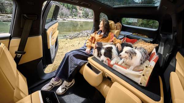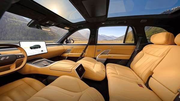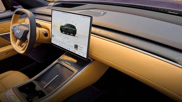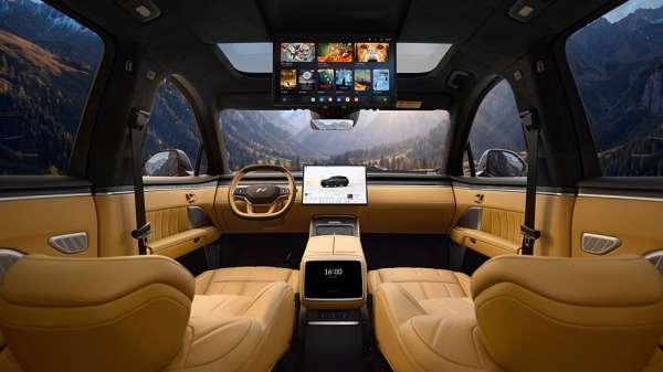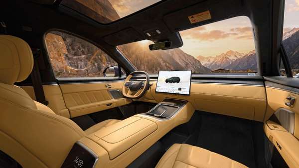 В салоне Onvo L80 нет физического приборного экрана, его роль выполняет 35-дюймовый проекционный экран дополненной реальности на лобовом стекле. Мультимедийный экран на передней панели — 17,2-дюймовый. Для задних пассажиров на тумбе между передними креслами предусмотрен 8-дюймовый настроечный экран, под которым расположен 8,8-литровый холодильник. На поперечине в потолке разместился откидной 17,3-дюймовый киноэкран. В состав штатной 2048-ваттной аудиосистема входят 23 динамика. Отделка салона — вполне премиальная, из натуральной кожи, а в декор для уюта добавлено дерево с открытыми порами.
