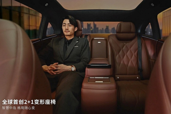 Предтоповое и самое богатое исполнения – это также пневмоподвеска, встроенный в фары проектор, натуральная кожа, дополнительная беспроводная зарядка спереди, отсек с функциями подогрева и охлаждения, система активного шумоподавления, динамики в подголовнике водительского кресла, массажер и подогрев всех сидений. А еще в этих комплектациях седан Hyptec A800 может стать четырехместным. Нужно будет лишь нажать кнопку, после чего центральная часть спинки заднего дивана опустится, а центральная же часть непосредственно сиденья – поднимется. В итоге, получится массивная «тумба» с отдельным тачскрином (7,9 дюйма), площадками для зарядки телефонов и ящичком, прикрытым шторкой. Такое решение в Hyptec назвали «2+1», для начальных версий это опция.