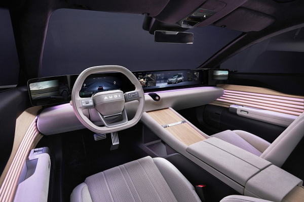 В салоне – изогнутое табло на всю ширину передней панели (на боковые дисплеи выводится картинка с наружных камер) и двухэтажный центральный тоннель. Кроме того, у AUDI E есть виртуальный помощник.