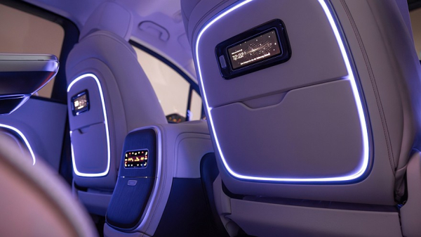 Передняя панель имеет типовое мерседесовское табло MBUX Superscreen, приборный экран здесь 10,25-дюймовый, центральный настроечно-мультимедийный — 14-дюймовый, а для переднего пассажира в виде опции доступен собственный развлекательный 14-дюймовый экран. Опция для водителя — проекционный 23,1-дюймовый экран. Между передними сиденьями может быть пустота либо высокий центральный тоннель. Для задних пассажиров предусмотрен 31,3-дюймовый развлекательный экран на потолке, на нём можно даже запускать видеоигры. Топовая аудиосистема Burmester насчитывает 22 громкоговорителя. Электронных ассистентов водителя будет много, но среди них не будет автопилота 3 уровня — Mercedes-Benz и BMW от него дружно отказались.