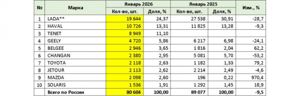 Топ-10 марок на рынке новых легковых автомобилей в январе 2026 года (шт.)