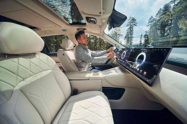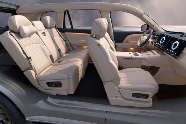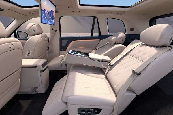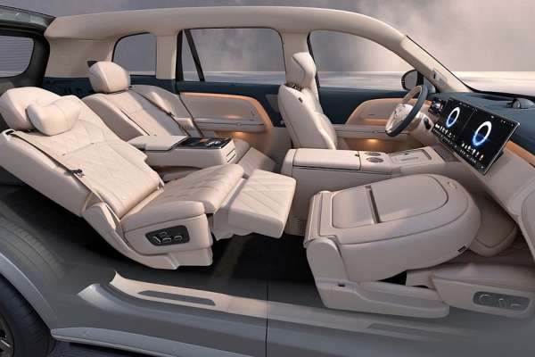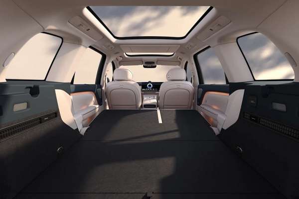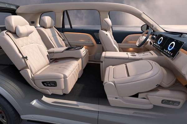 В салоне перед водителем установлен приборный экран размером 10,25 дюйма, а всю остальную площадь передней панели занимает табло, состоящее из двух тачскринов – каждый диагональю 15,6 дюйма (у флагмана одиночный центральный планшет). Мультимедиа работает на операционке HarmonySpace от Huawei. Свой, «потолочный», развлекательный экран предусмотрен и для задних пассажиров. На тоннеле есть площадка для беспроводной зарядки, а в его торец встроен выдвижной бокс с функциями подогрева и охлаждения. Объем багажника варьируется от 1148 до 2361 л.
