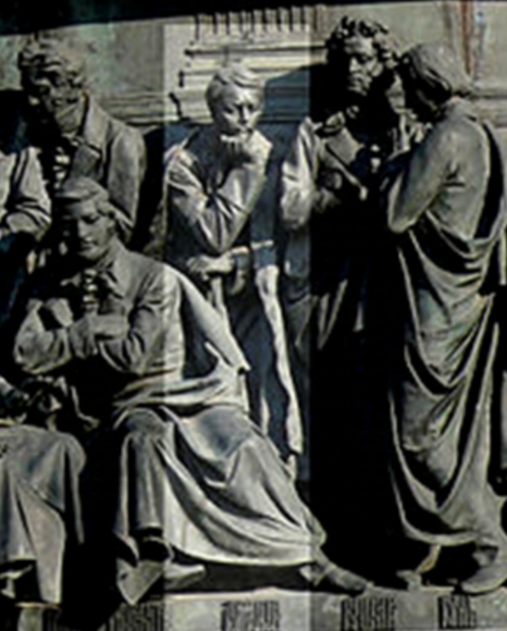 Памятник, посвященный тысячелетию России в Новгороде. В центре рядом с Пушкиным изображен Лермонтов