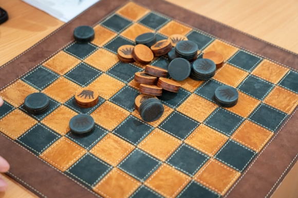 — Игральные кожаные шашки с доской из кожи в кожаном футляре,