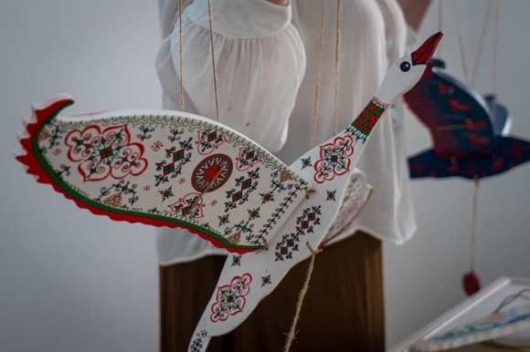 — Деревянные гуси-лебеди с традиционным орнаментом, предназначение которых охранять покой младенца в подвесе над его кроваткой.