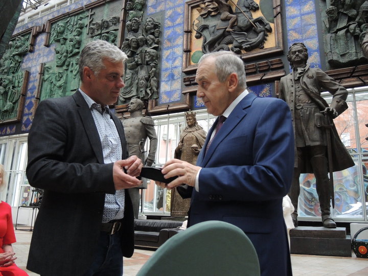 У микрофона академик Олег Кошкин, который вел всю торжественную церемонию. Он тут же обозначил, что, вообще-то, Александр по-русски — это Саша, и с теплотой обращался к скульптору на русский манер.