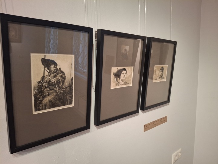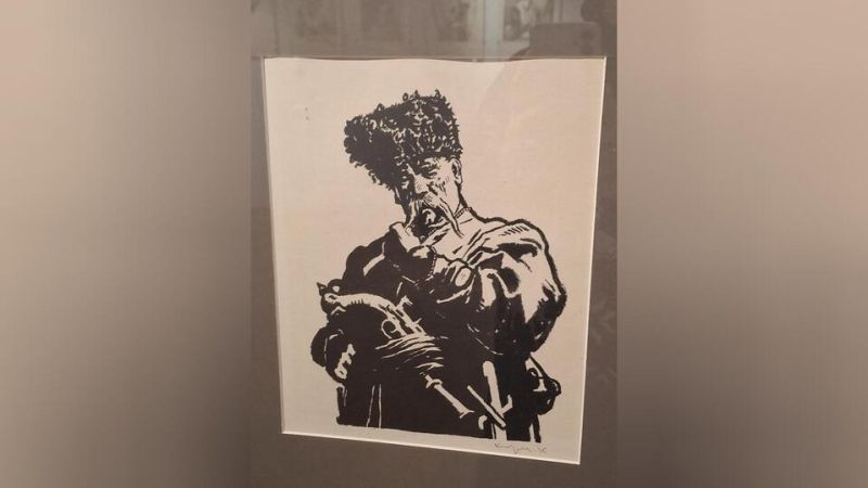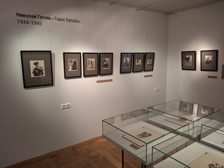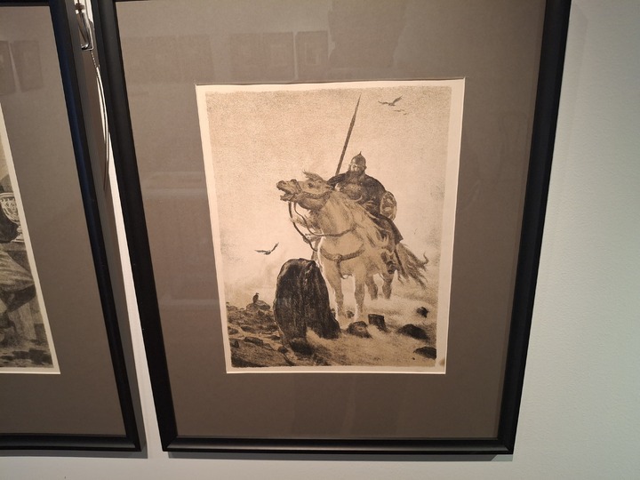 При этом наследие Евгения Адольфовича не ограничивается, конечно же, иллюстрированием Гоголя. На верхнем этаже московского дома Брюсова, где действует выставка, есть отдельный блок, посвященный исторической повести Ромена Роллана «Кола Брюньон». Далее, если двигаться по часовой стрелке по первому залу, идет «Тарас Бульба» — подборка автолитографий 1944-1945 годов, включающая портреты сыновей Бульбы Остапа и Андрия, сцену свидания Андрия с польской красавицей-панночкой, «Танцующих казаков», вышеназванного «Тараса Бульбу на коне», «Осаду города» (польского). И наиболее эмоциональную работу — акварель «Сожжение Тараса», написанную поверх литографии.