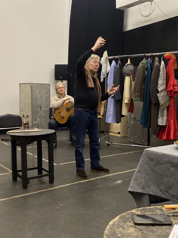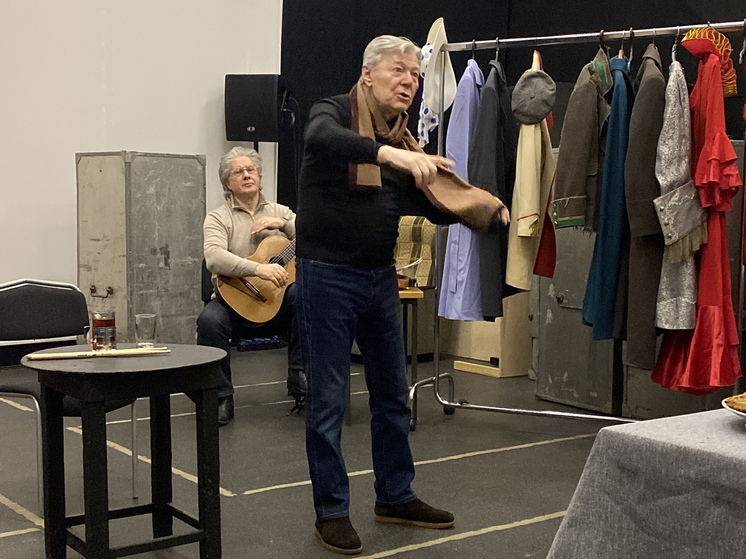 С ним я перенеслась в другое время, какое в силу возраста и не знала — послевоенное, 50- ые годы, дальше — уже теплее. А вместе со мной в него погрузились ещё несколько человек — гитарист Юрий Нугуманов, режиссёр Ильдар Гилязев — он помогает артисту, звуковик на пульте и две совсем молоденькие актрисы — студентки или только что принятые в труппу.