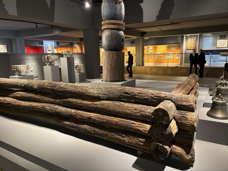 Получается, экспозиция не столько про архитектуру древнего города, сколько про мастерство и зодчих, и самих строителей, которые воплощали в жизнь смелые идеи творцов. Наблюдать за «рождением» шедевра, шаг за шагом встраивая путь к современности, и предлагают нам на выставке. В центре внимания (и зала) — угол деревянного сруба с территории Московского Кремля, его обнаружили на территории Тайницкого сада на глубине четырех метров. В этом же месте стояли церковь Константина и Елены и дворы священнослужителей, поэтому можем предположить, что сруб, скорее всего, принадлежал кому-то из них.