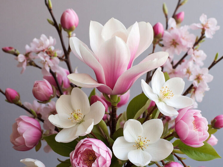 Ещё одна яркая тенденция — цветущие ветки в составе букета. Магнолия, вишня, яблоня добавляют композиции высоту и архитектуру. Букет перестаёт быть просто круглой формы — он становится разноуровневым, почти интерьерным объектом. Такие композиции активно покупают как в подарок, так и для дома.