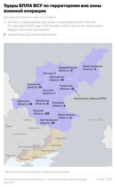 В ночь на 11 марта произошла массированная атака украинских дронов на Подмосковье. Минобороны отчиталось о перехвате 91 беспилотника над столичным регионом.