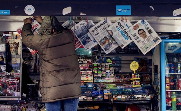 Продавец киоска развешивает газеты, освещающие обстановку в Мексике после убийства Немесио Осегеры Сервантеса (Эль Менчо), Мехико