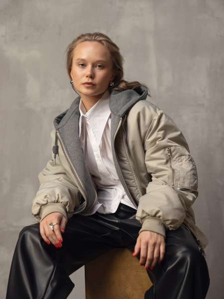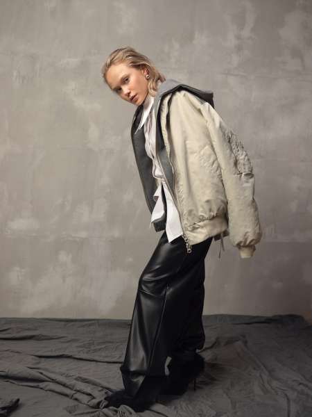 Гимнастка позировала в свободных черных кожаных брюках, белой рубашке и куртке-бомбере с капюшоном. Ангелина выбирала брутальные позы, направив в камеру дерзкий взгляд. Спортсменка все же добавила к наряду пару женских вещей – крупные серьги и черные ботильоны на шпильках.