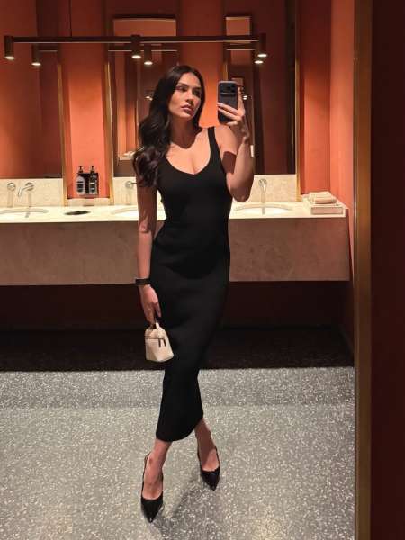 Она остановила свой выбор на длинном черном облегающем платье с глубоким вырезом и без рукавов. Брюнетка дополнила образ черными туфлями на шпильке, маленькой сумочкой и наручными часами.