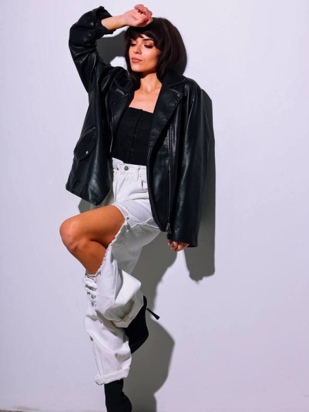 Аделина пришла на съемку в дерзком и сексуальном наряде. Она надела джинсы с очень большими дырами на коленях, черный корсет, ботильоны на шпильках и кожаную куртку. Спортсменка изменила прическу, появившись перед фотографом с густой челкой.