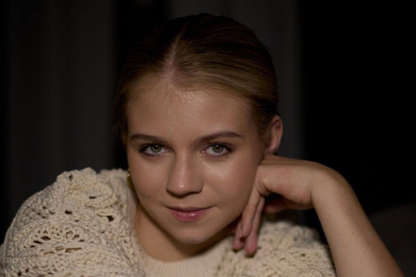 Теперь она одета в розовое платье с рукавами-крылышками, светлые волосы собраны в женственную прическу, на лице макияж с акцентом на глаза. Александра улыбается и трогает свои волосы.